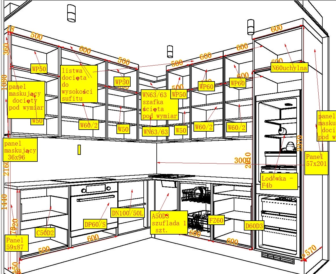 Podczas spotkania projektowego, pracownik tworzy nam zarówno wizualizację jak i techniczny podgląd szafek z opisanymi ich kodami (czerwono-żółte). Ponadto należy zadbać aby projekt uwzględniał komentarze dotyczące ustaleń, modyfikacji czy rozwiązań przewidzianych w projekcie (np. kalkulację ilości blend, czy obniżenie szafek do konkretnej wysokości).